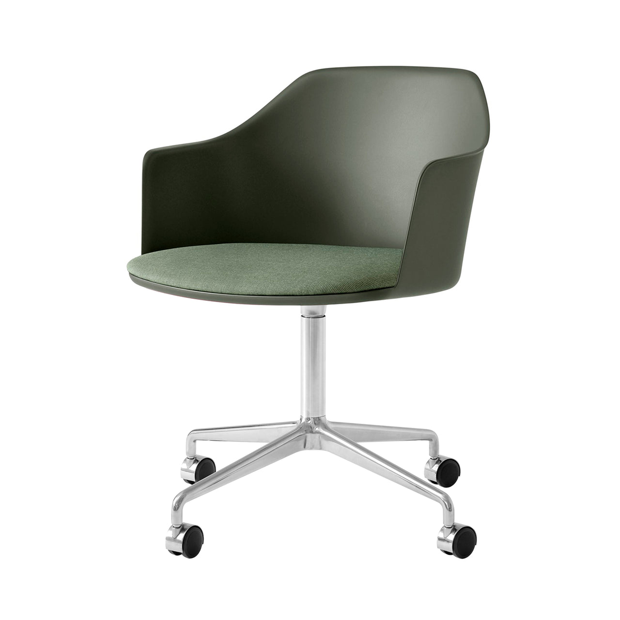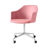 Gleaming polished aluminum gives an urbane character to the 4-star swivel base with rolling castors in Hee Welling's sustainable armchair that also features an upholstered seat. Rely breaks the mold of classic Scandi shell seating with its innovative fabrication in 100% recycled polypropylene. The chair curves around the body and extends out along the side to provide crucial back support while custom choices for the seat covering span a wide selection of premium textiles and leather.