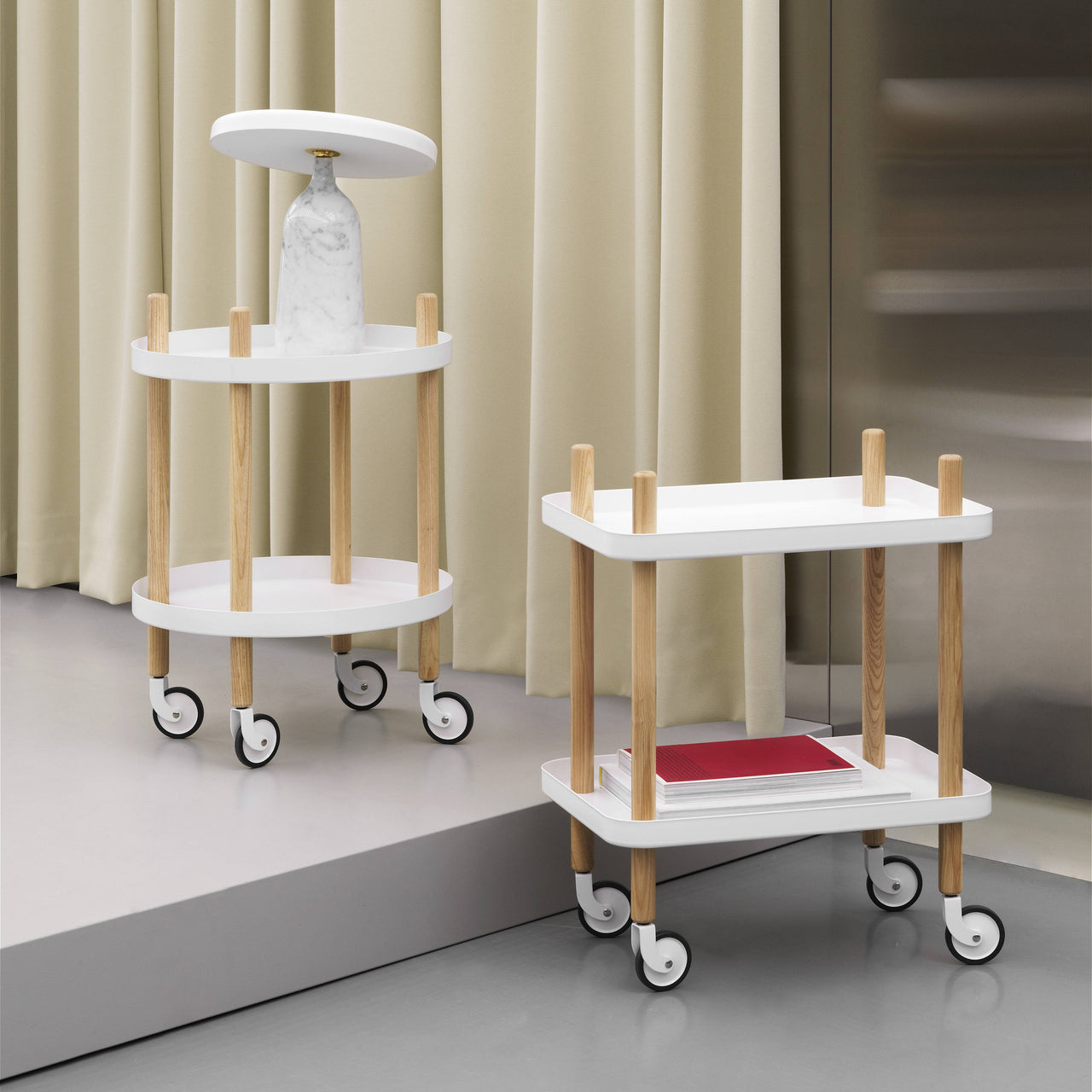 Ideal as a tea cart or end table or even nightstand, this mobile table can move in every direction. Simply pull one of the four ash wood "handles," the posts which serve as legs—on wheels. The matte color softens the effect of the steel surface, adding to its beauty. "Designing is an interaction between craftsmanship and industry, and both elements need to come together," says young designer Simon Legald, who graduated from the Royal Danish Academy of Fine Arts in 2012. His concept is realized by fellow Danes Normann Copenhagen. "Block is a simplification and modernization of the well-known tray table."