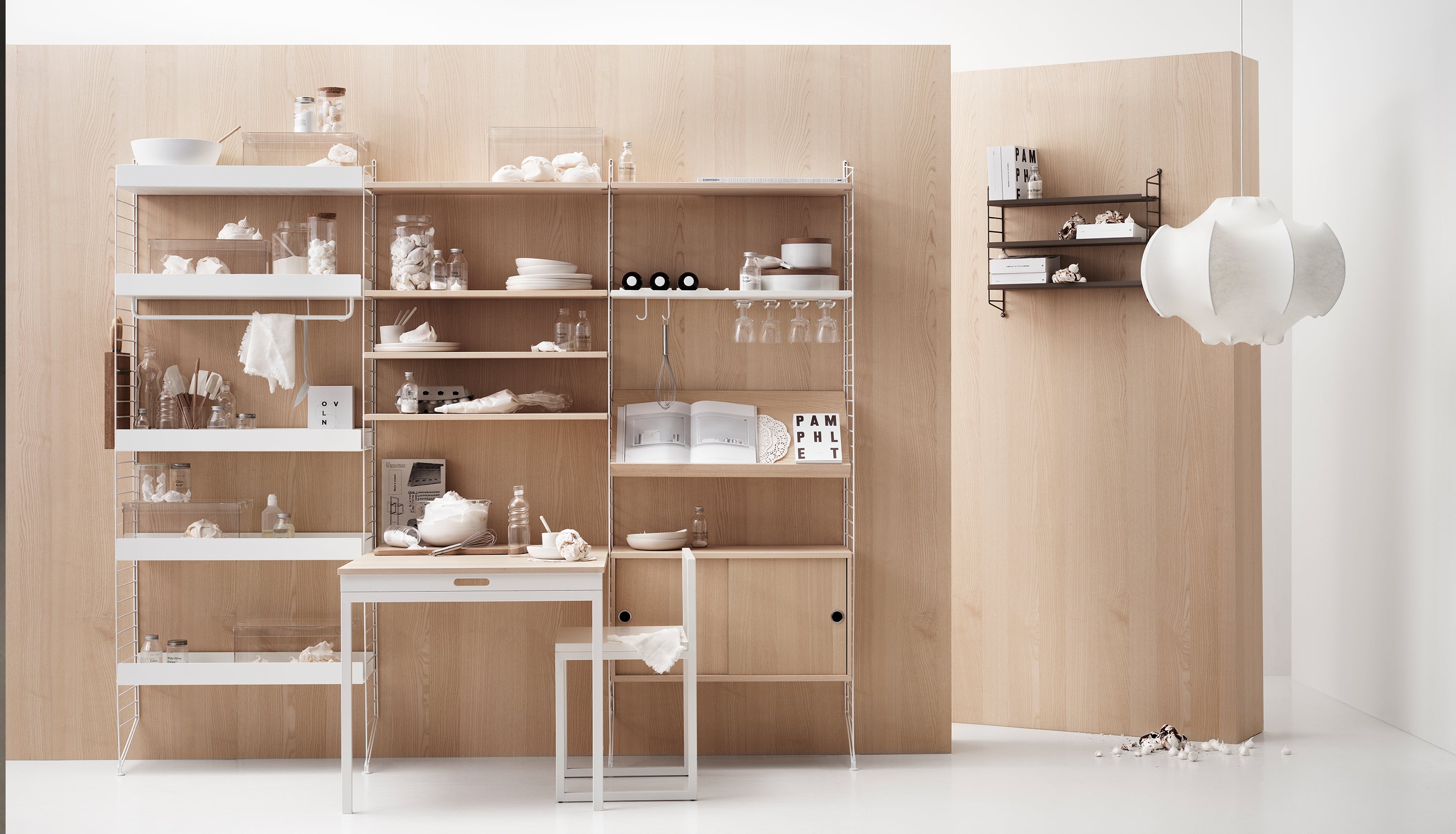 Any space, retail or residential, office or organizational, can transform with String. From glass-faced cabinets and folding desks, to plastic hanging containers and slanted shoe shelves, to felted acoustic walls and clothes hanging racks, the wide-ranging variety of iterations this iconic system of design offers is endless.