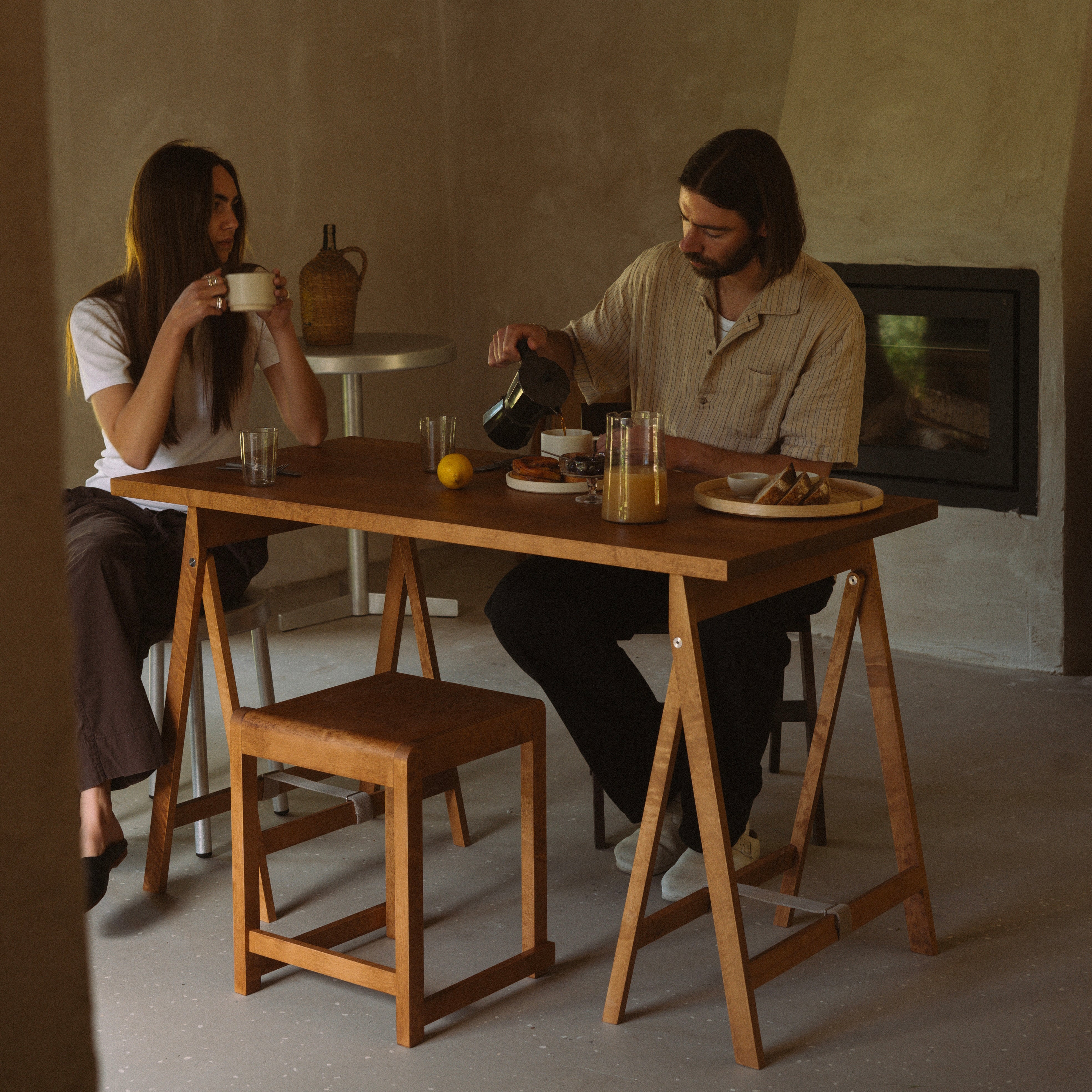 This folding trestle table provides a practical surface for various spaces. It consists of two separate components: folding trestles and a tabletop, making it easy to move and store. The trestles can be paired with different tabletops and are stabilized by non-slip gel pads and recycled cotton webbing. Made from brown birch wood, the table is both durable and lightweight.