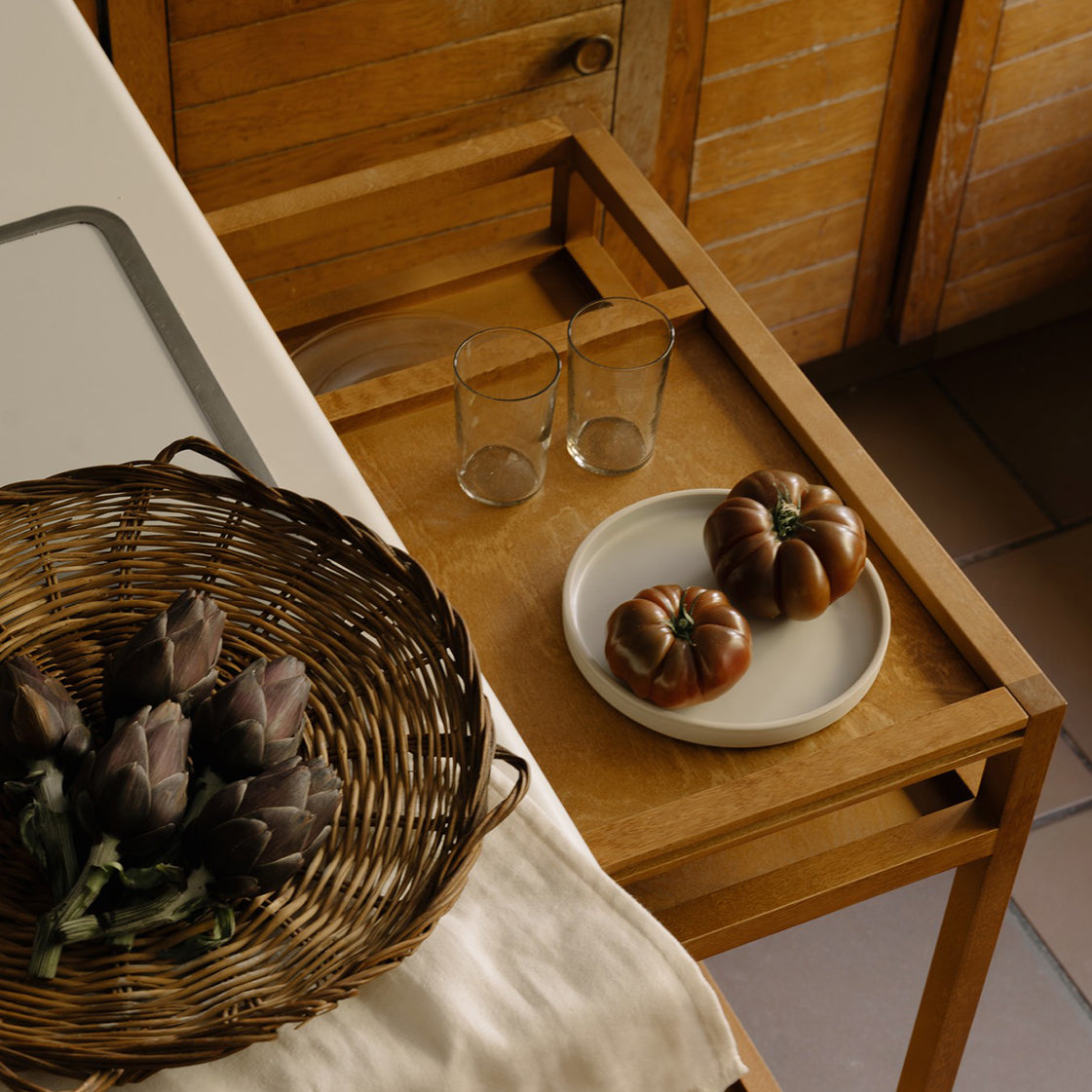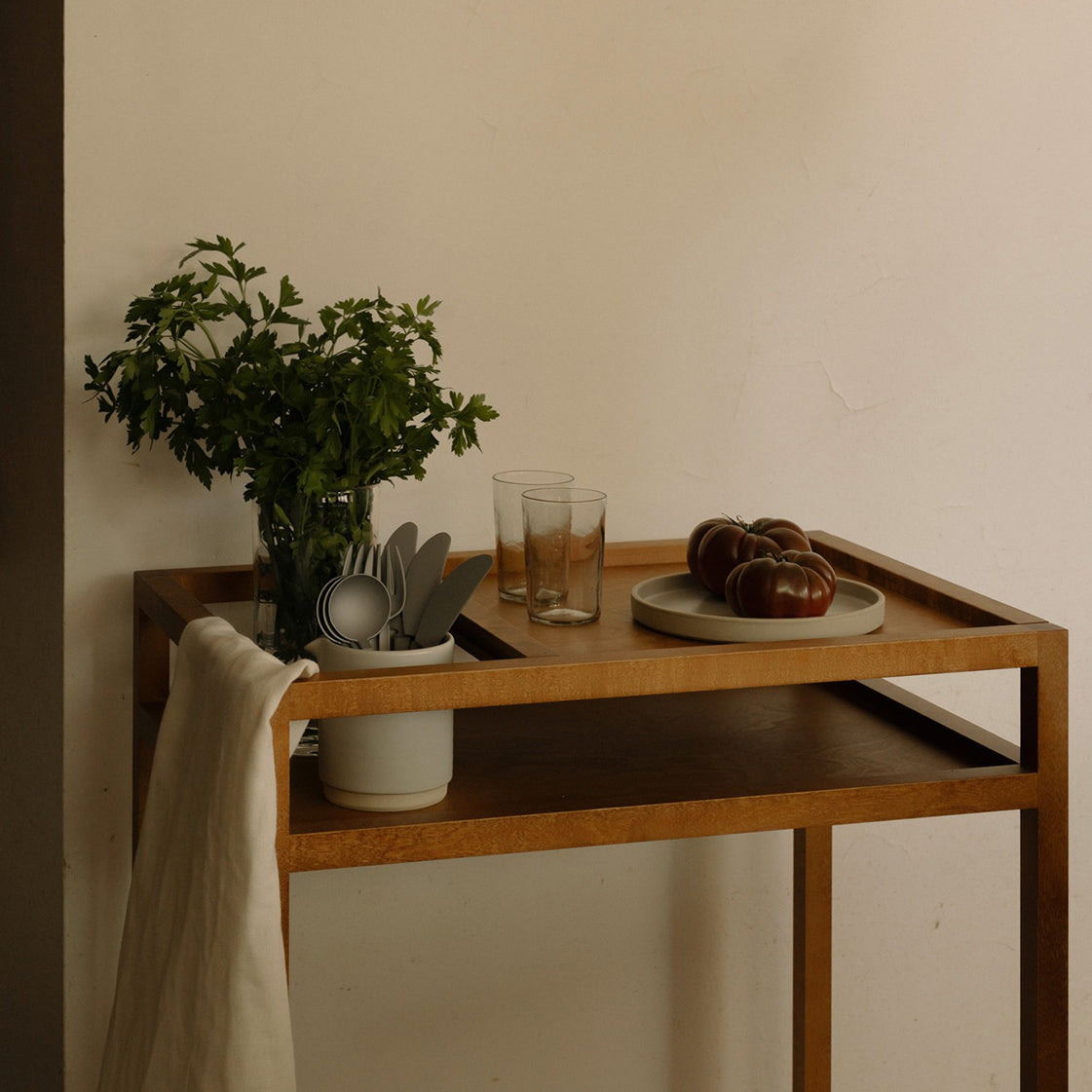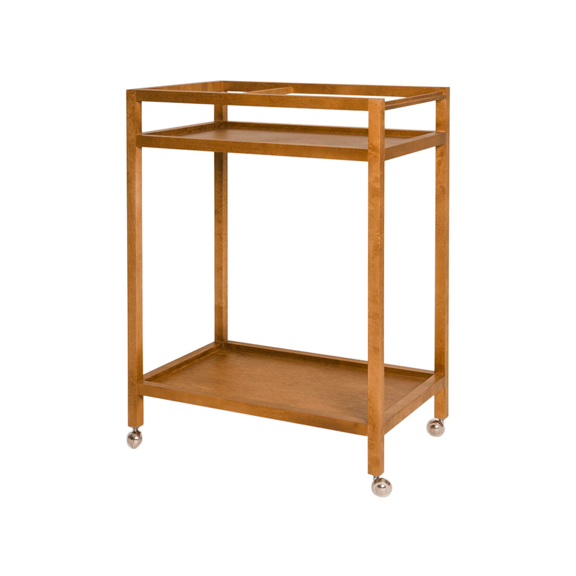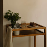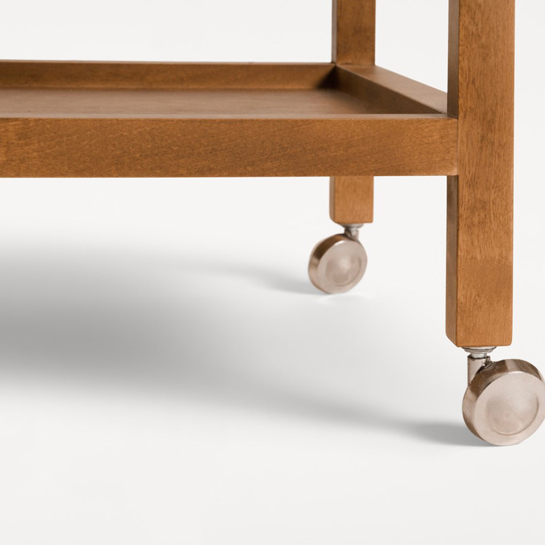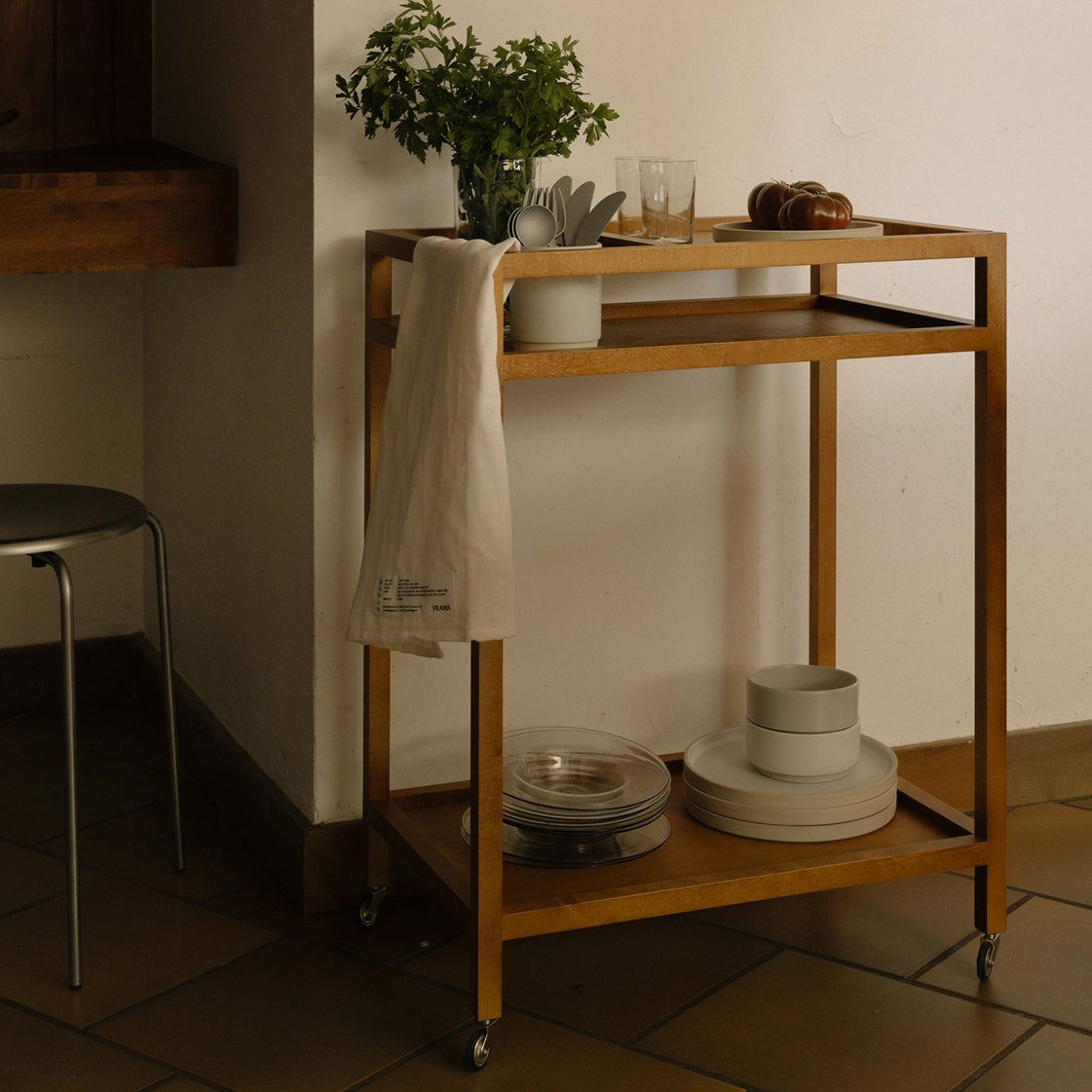 Featuring a removable tray and smooth-rolling castor wheels, this trolley is designed for ease of movement and practical use, whether for serving or display. Made from stained and lacquered birch in a warm brown tone, its surfaces are both durable and refined.
